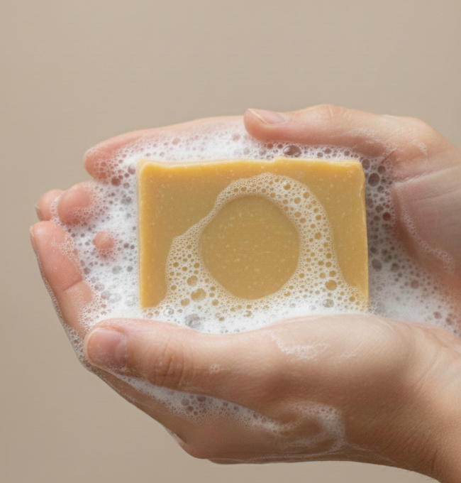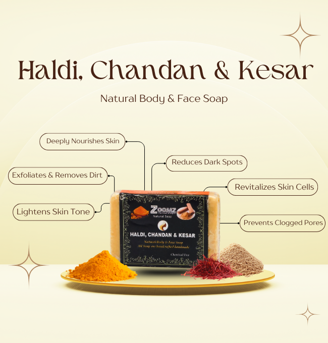 Experience the age-old Ayurvedic goodness of Haldi (Turmeric), Chandan (Sandalwood), and Kesar (Saffron) in this luxurious handmade soap. Crafted with natural ingredients, this soap deeply cleanses, nourishes, and enhances the skin’s natural radiance while keeping it soft and hydrated. Blended using traditional cold-process methods, each bar is chemical-free, gentle on the skin, and suitable for daily use on both face and body.